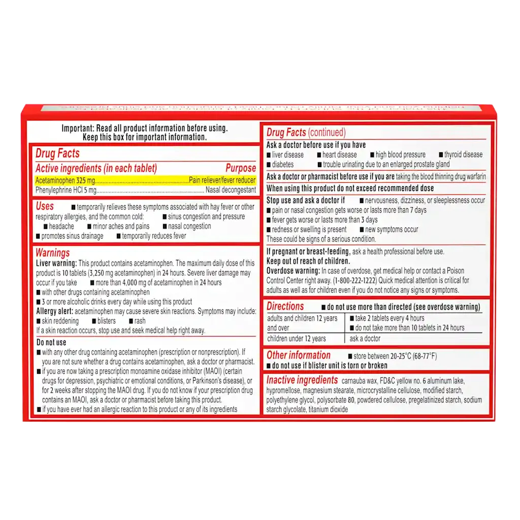 The tablets typically contain pseudoephedrine hydrochloride, a powerful decongestant that helps shrink swollen blood vessels in the nasal passages to relieve blocked sinuses and improve airflow. They also contain ibuprofen, a well-known anti-inflammatory pain reliever that helps reduce headaches, fever, and sinus pressure.