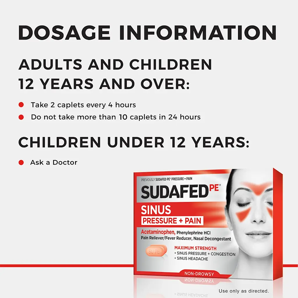 Sudafed Sinus Pressure & Pain Tablets are formulated to relieve the uncomfortable symptoms of sinus congestion, sinus headaches, and cold-related pain. This dual-action formula works quickly to reduce swelling in the nasal passages while also relieving pain and inflammation.