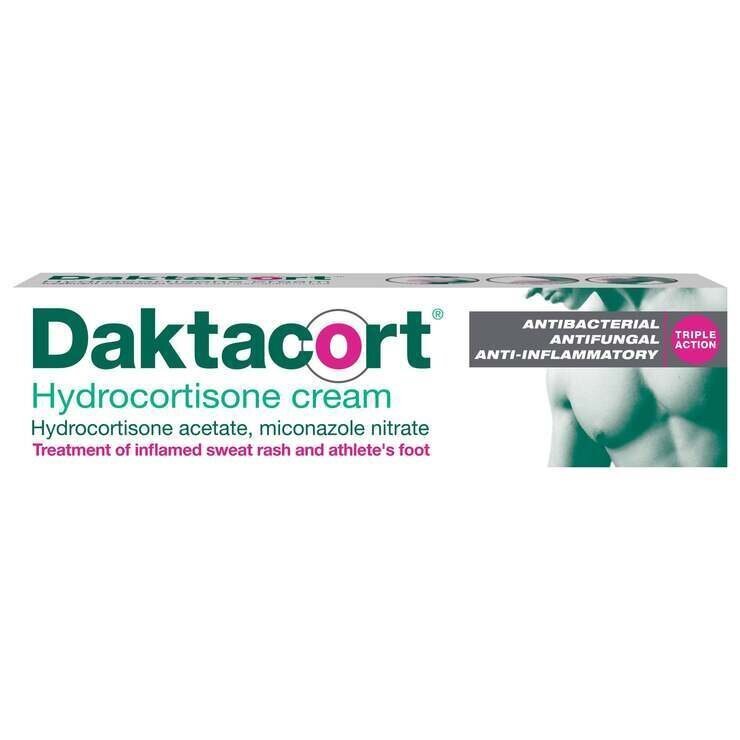 Daktacort Hydrocortisone Cream is a combination antifungal and anti-inflammatory cream used to treat inflamed fungal skin infections. It contains Miconazole nitrate 2% to fight fungal infections and Hydrocortisone 1% to reduce redness, itching, and swelling. Apply a thin layer to the affected area twice daily for up to 7 days.