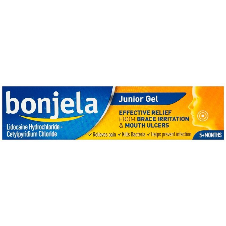 Bonjela Junior Gel (15g) is a banana-flavored, sugar-free gel that relieves pain from mouth ulcers, braces, and denture irritation in children over 5 months and adults. Fast-acting and antiseptic.