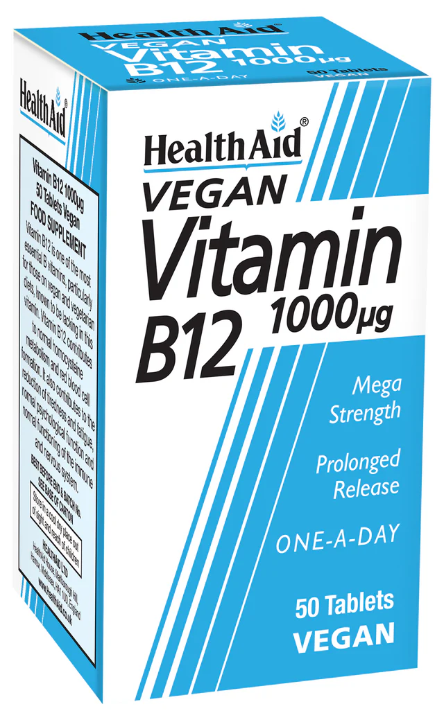 HealthAid Vitamin B12 1000µg is a high-strength dietary supplement designed to support energy levels, nervous system function, and red blood cell formation. Available in prolonged-release tablets, sublingual tablets, and an oral spray, it provides flexibility for your preferred mode of intake.