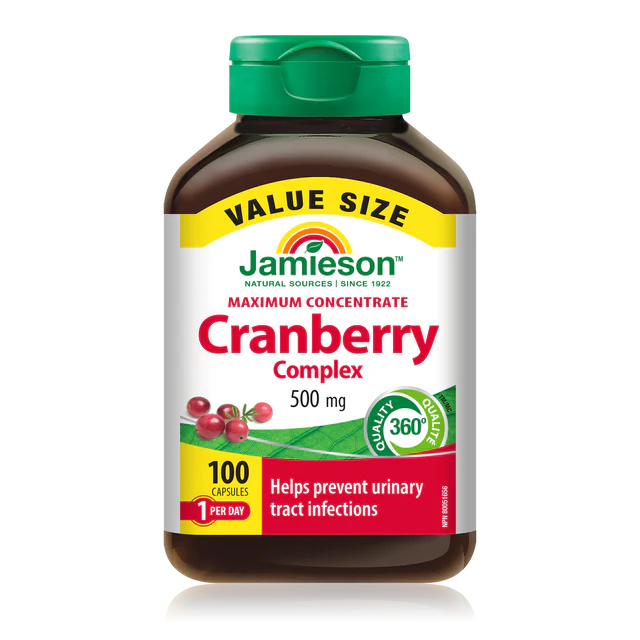 Jamieson Cranberry Complex (500 mg) supports urinary tract and bladder health, combining high-potency cranberry extract with D-Mannose for UTI prevention and antioxidant benefits.
