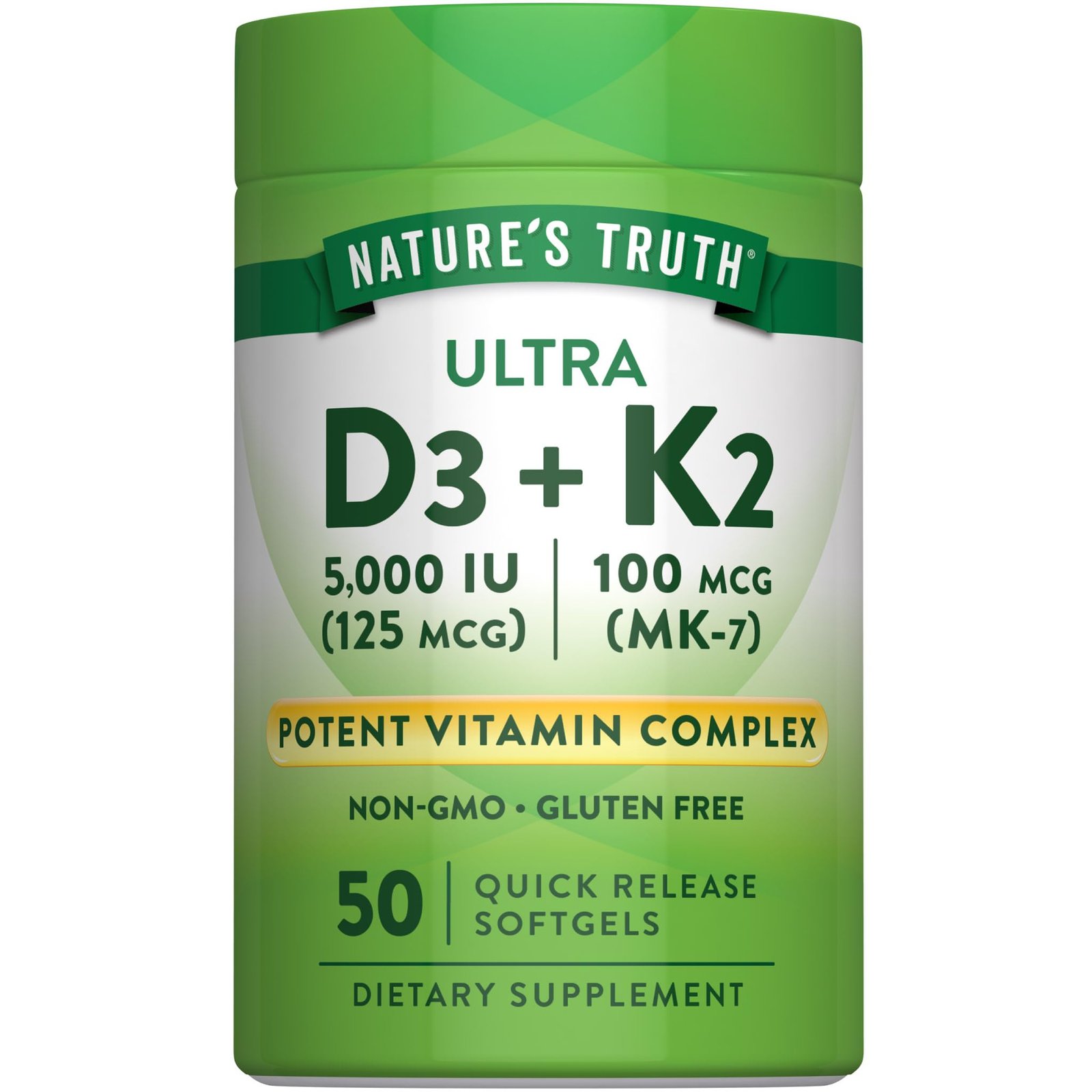 Nature’s Truth Ultra K2 + D3 is a high-potency daily softgel combining Vitamin K2 (MK-7) 100mcg and Vitamin D3 5000 IU. It supports bone strength, cardiovascular wellness, and immune function by helping regulate calcium in the body.