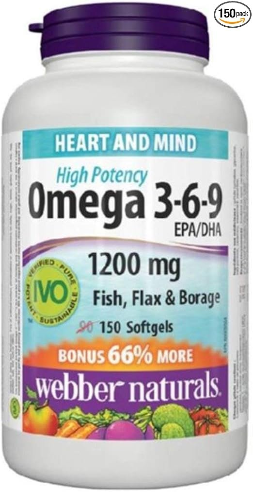 Webber Naturals Omega 3-6-9 1200mg supports heart, brain, skin, and joint health with a triple blend of fish, flaxseed, and borage oils.
