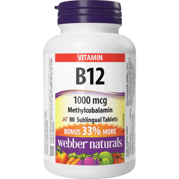 Webber Naturals Vitamin B12 1000mcg Sublingual Tablets are high-potency sublingual B12 tablets with 1000 mcg Methylcobalamin. Designed for rapid absorption under the tongue, they help boost energy, support nerve health, and aid red blood cell formation. Ideal for vegetarians, seniors, or those with absorption issues.